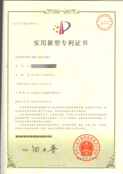 • 混凝土攪拌運輸車實用新型專利證書